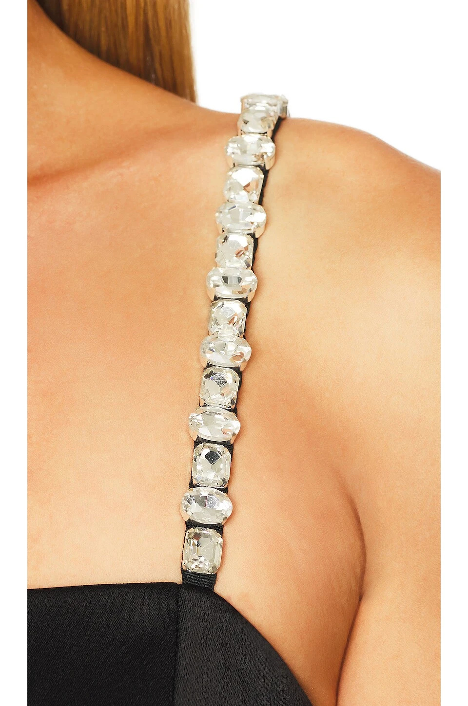 - Clear crystal accents at shoulder straps