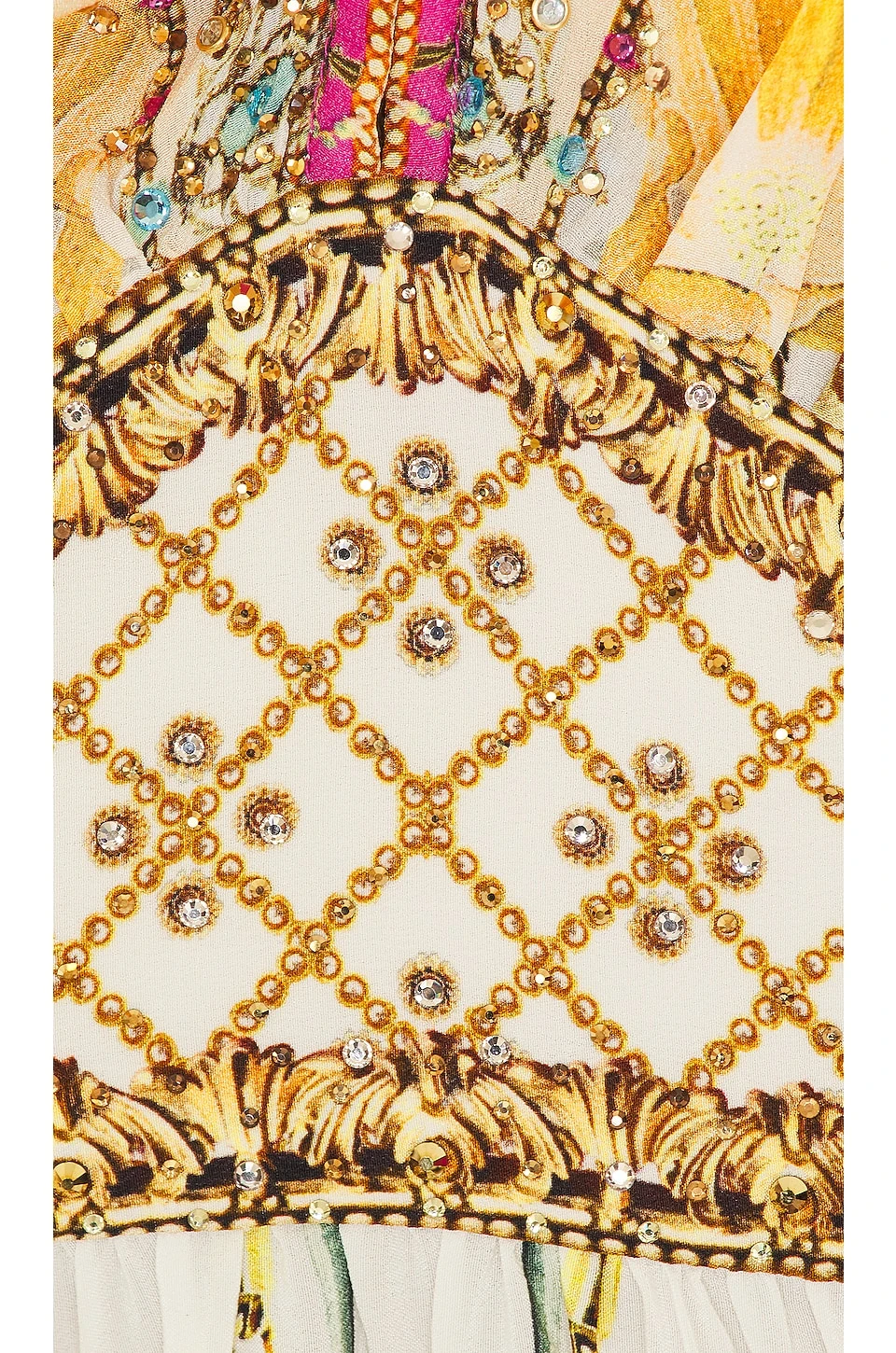 - Lightweight flowy charmeuse fabric with crystal embellished trim