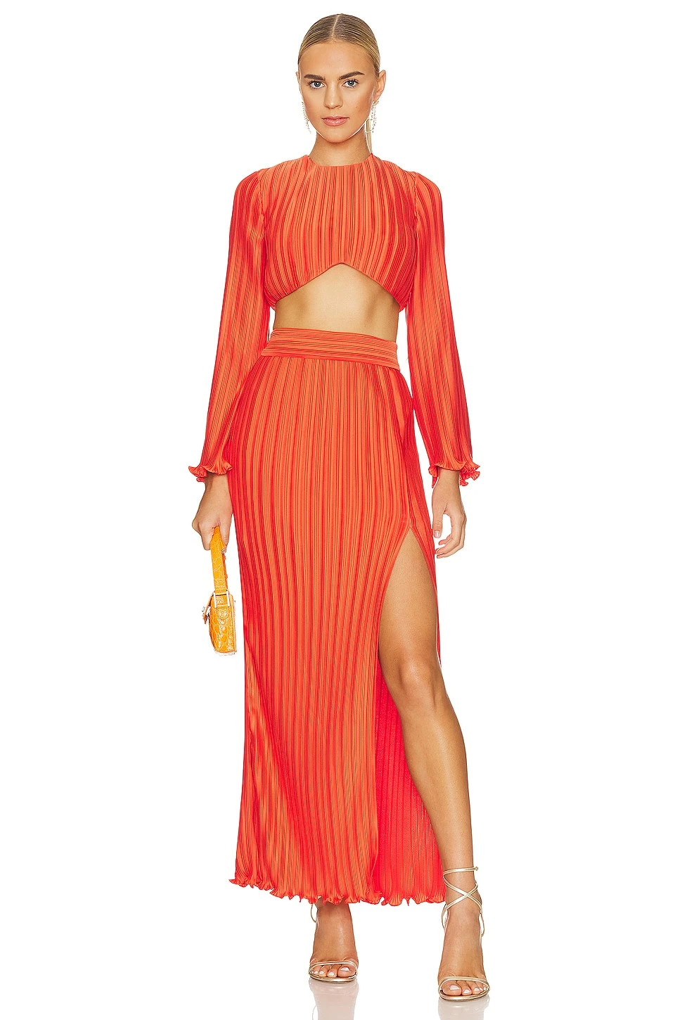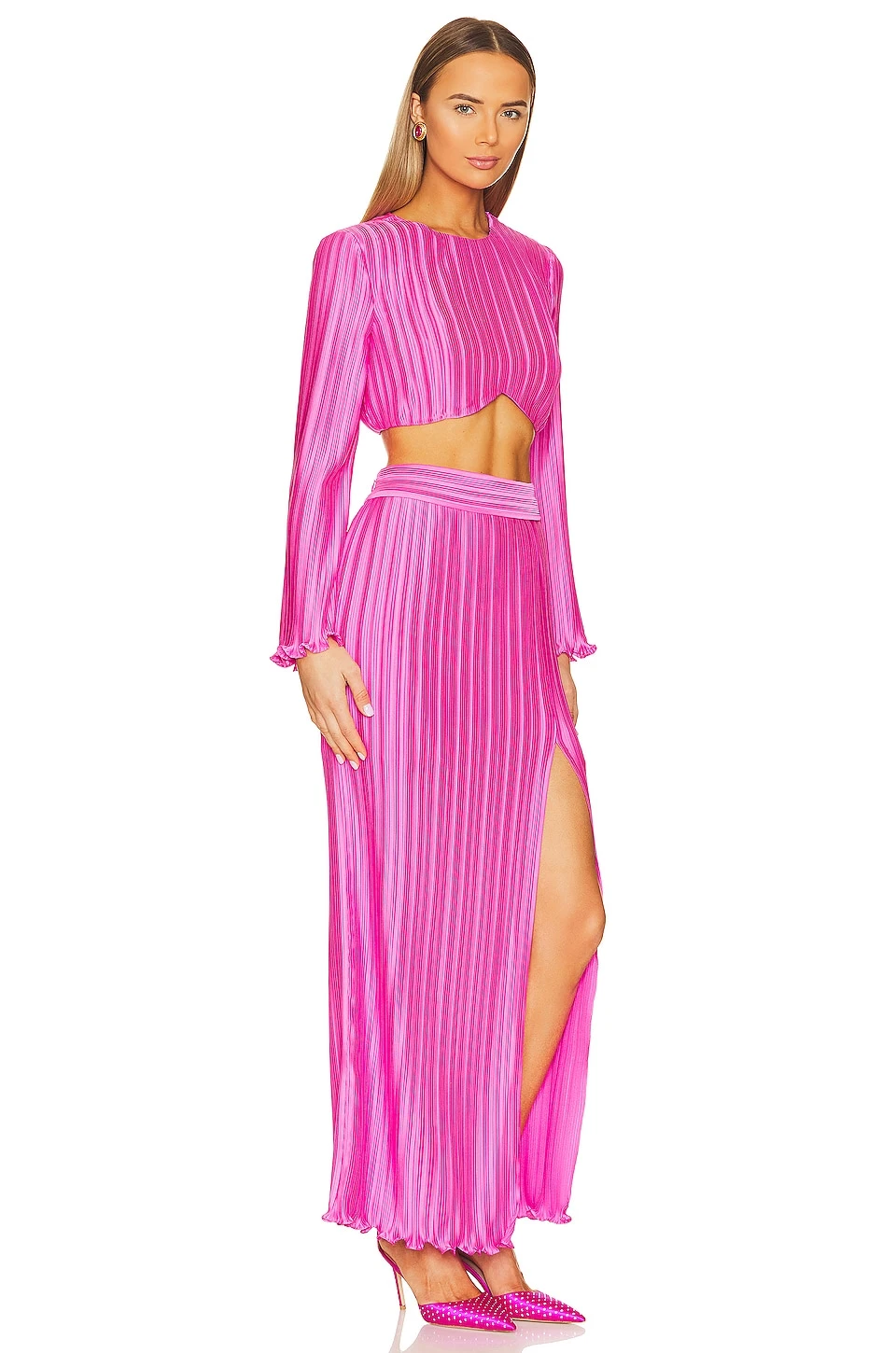 100% recycled polyester. Made in China. Dry clean only. Unlined. Top: Exposed back zipper closure. Skirt: Hidden side zipper closure with side seam slit. Pleated satin skirt with lettuce hem.Sold as a set. Skirt measures approx 43″ in length. Revolve Style No. AIFS-WD51. Manufacturer Style No. S0211.