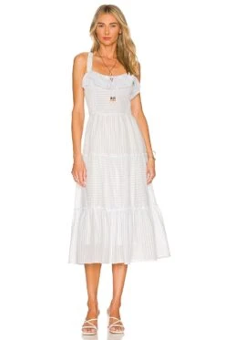 100% cotton. Made in China. Hand wash. Fully lined. Pull-on styling. Drawstring neckline with beaded ties and ruffle overlay.Elastic shoulder straps. Smocked back and side panels.Tiered voile fabric. Revolve Style No. HEAR-WD256. Manufacturer Style No. 222dq1a.