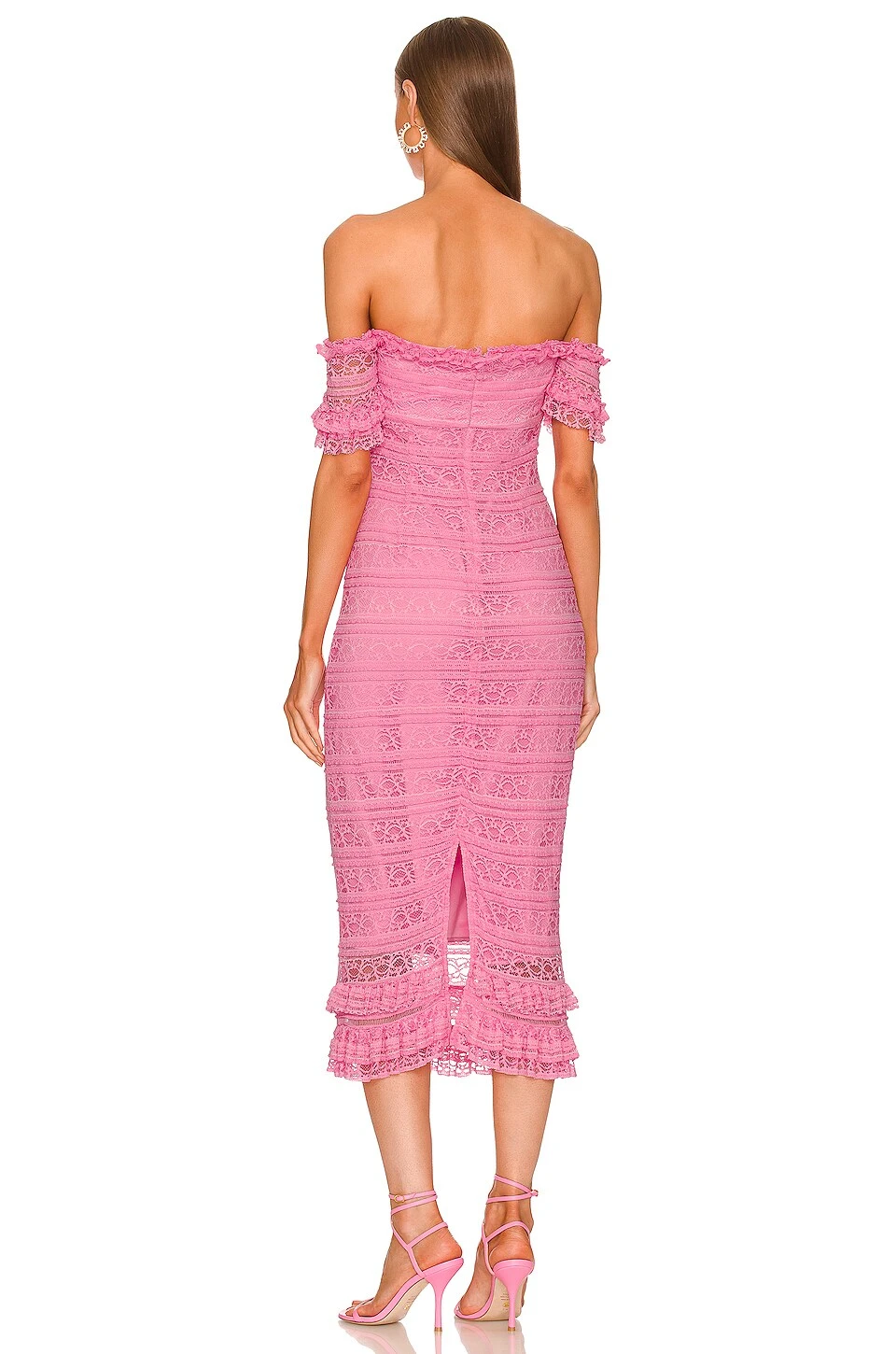 Self: 98% nylon, 2% spandex.Lining: 100% poly. Made in China. Machine wash. Fully lined. Hidden back zipper closure. Non-slip silicone grip lining with boned sides. Lace fabric overlay with ruffle detail throughout and elastic cuffs. Neckline to hem measures approx 39″ in length. Revolve Style No. LIKR-WD587. Manufacturer Style No. YD14704367Y.