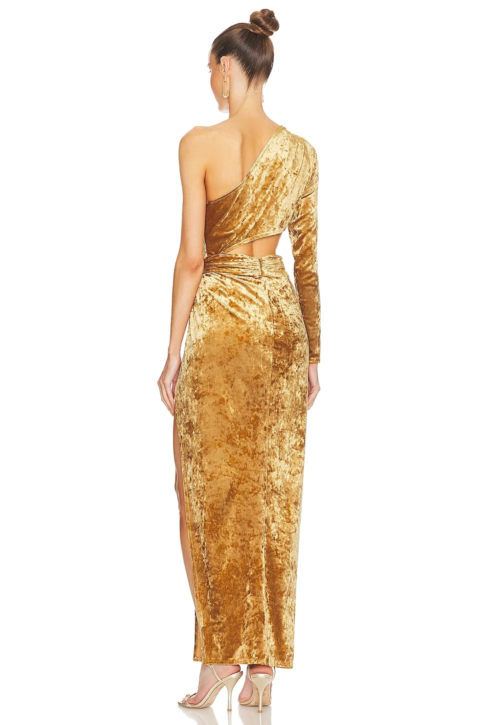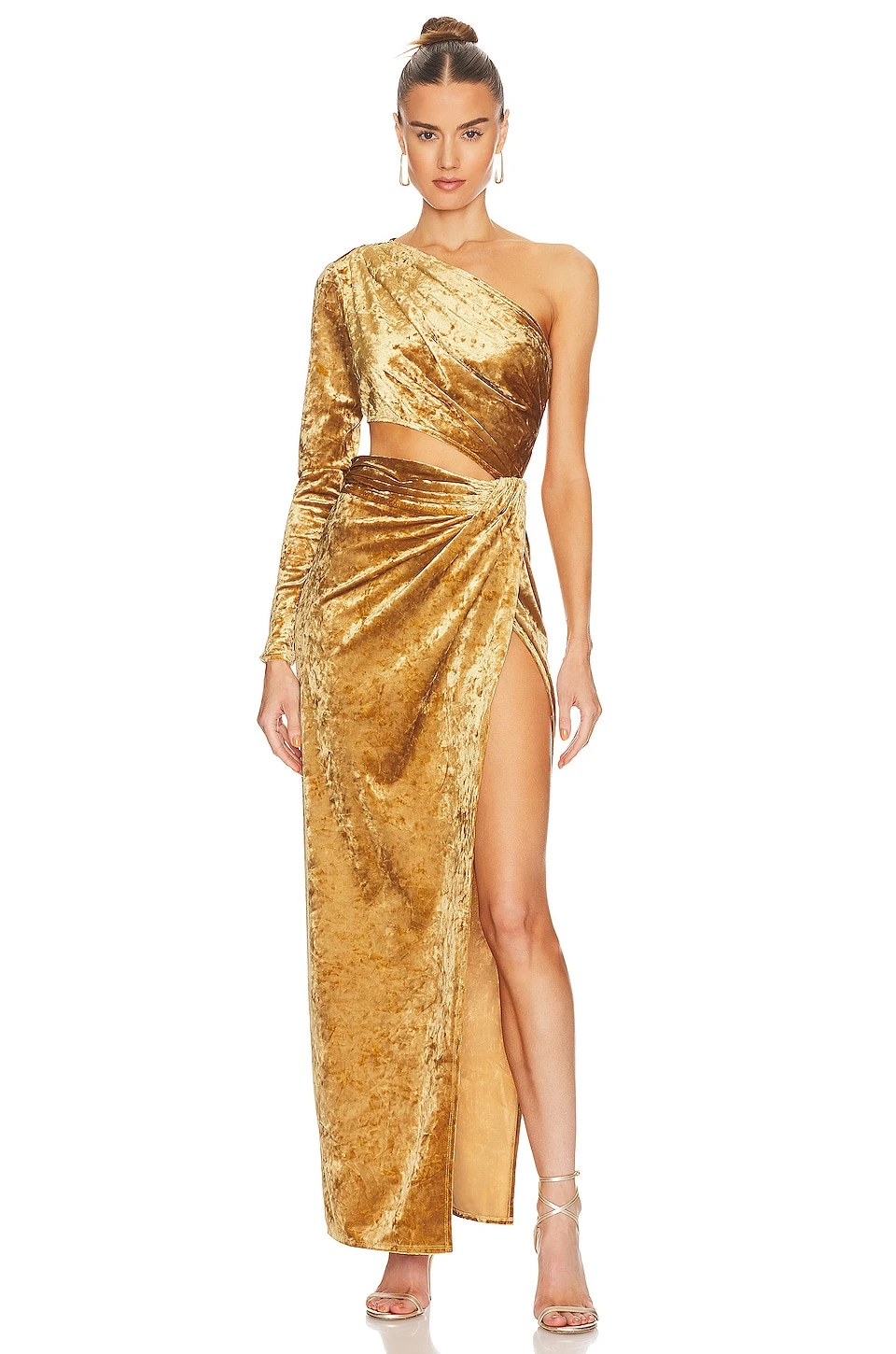 Bodice cut-out - Crushed velvet fabric with draped detail at waist and slit hem