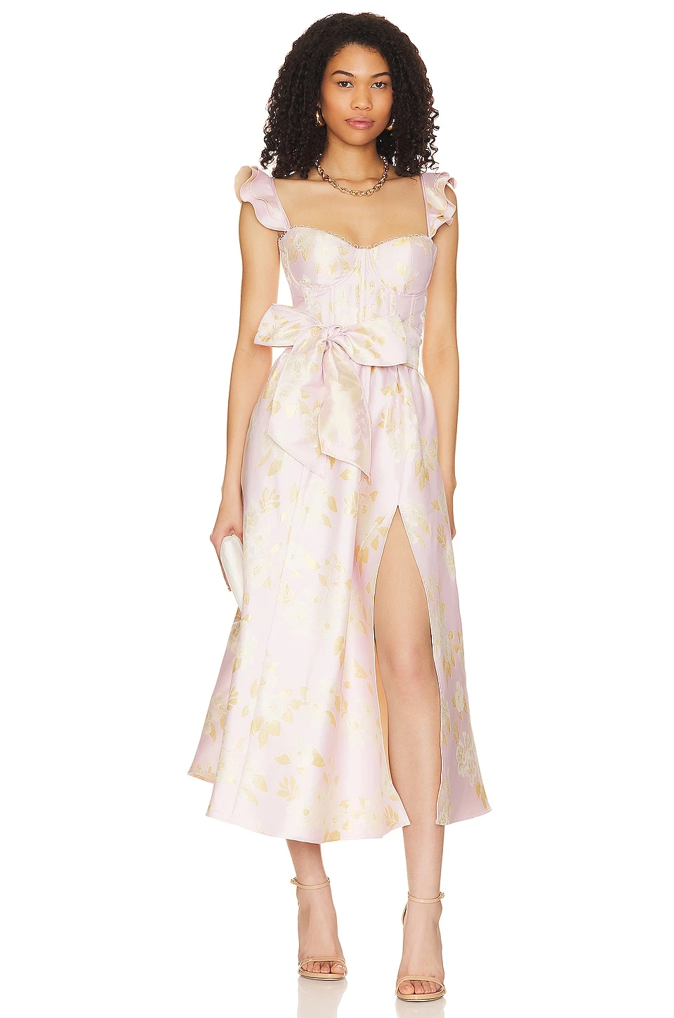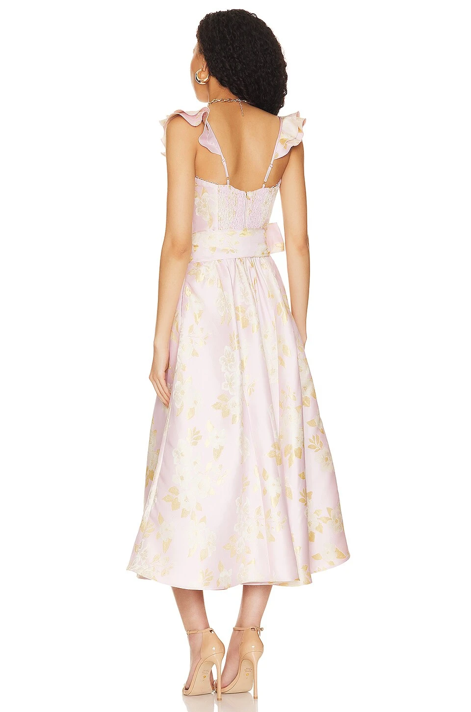 100% polyester. Made in China. Dry clean only. Unlined. Hidden back zipper closure.Detachable waist tie. Flutter sleeves with adjustable shoulder straps.Side slant pockets. Padded underwire bust.Boned bodice, smocked back, and side seam slit. Revolve Style No. VCHP-WD109. Manufacturer Style No. VD-255.